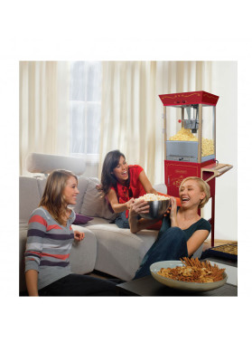 Designed for home use, the popcorn cart provides a vintage look and feel reminiscent of silent movie houses and carnivals of the early 1900s. The cart features a stainless steel kettle with a built-in stirring system.